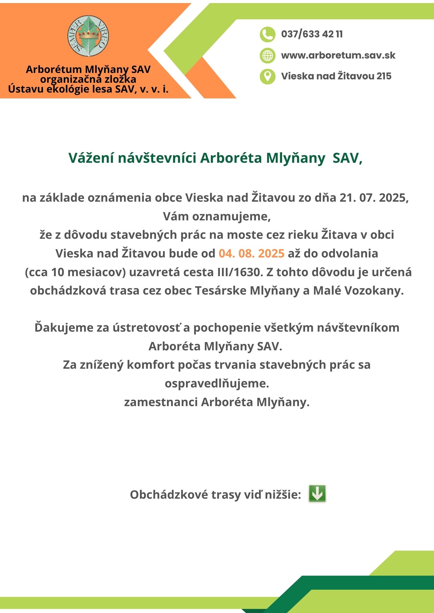 Oznam pre návštevníkov Arboréta Mlyňany SAV - stavebné práce na moste cez rieku Žitava aj v roku 2026